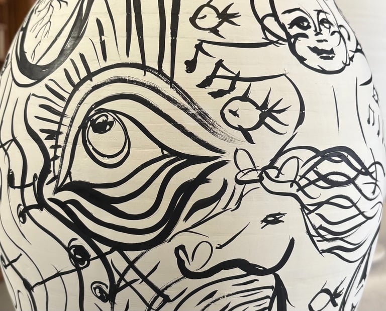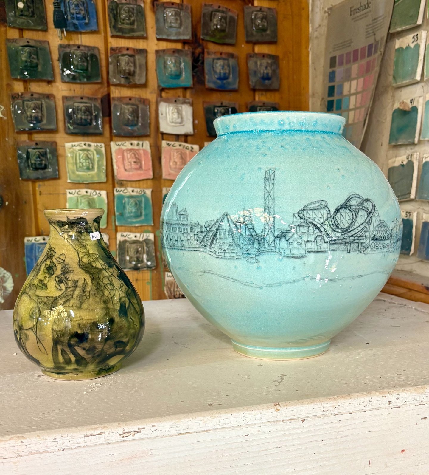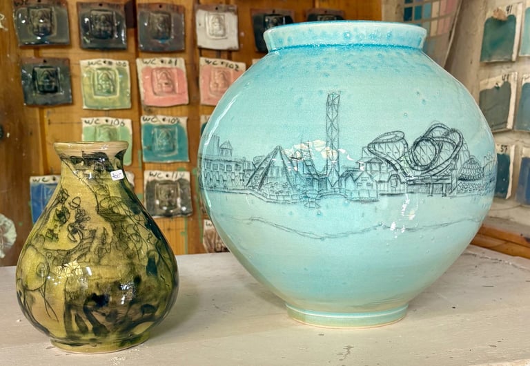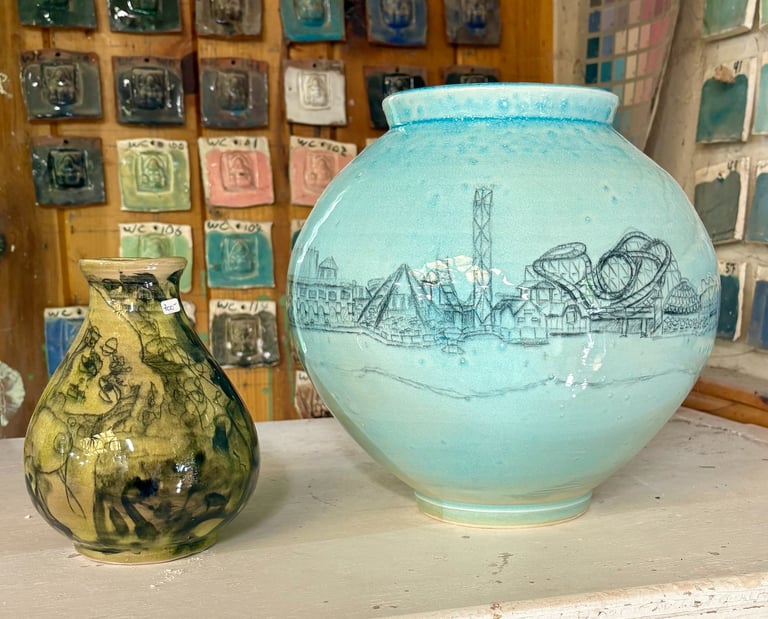 Thank you to everyone who came out and supported this year's Doon Art tour and dropped by spot #17. Over the past few weeks, I have been collaborating with Mattie Leeds and creating some lovely porcelain vases. This event showcases my first collection of vases based on the Santa Cruz Boardwalk. The moon vase allowed for a fisheye-inspired perspective sketched on with underglaze pencil and coated in a light seaglass blue. Stay tuned for more porcelain and pottery-related projects, and check out the official Doon Art tour website below.